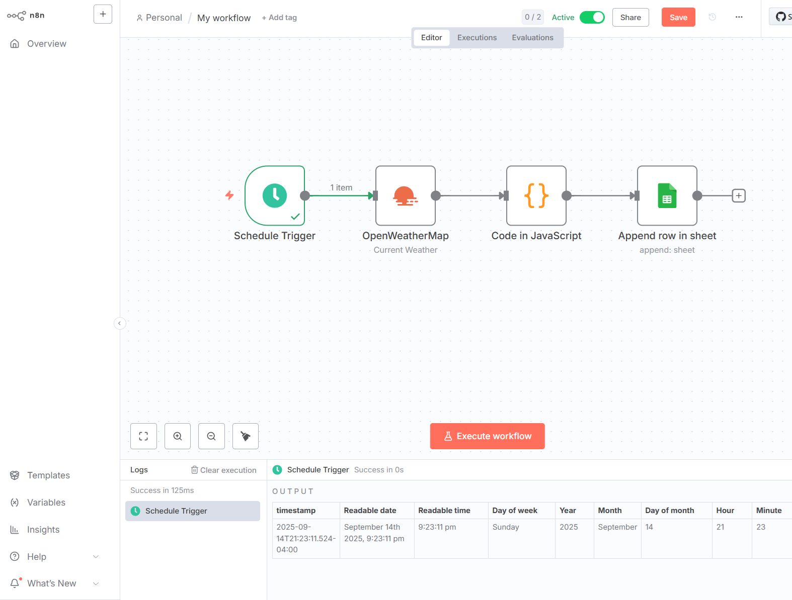 Workflow to check for weather in a particular location and save the information in the Spreadsheet. You can schedule the workflow easily