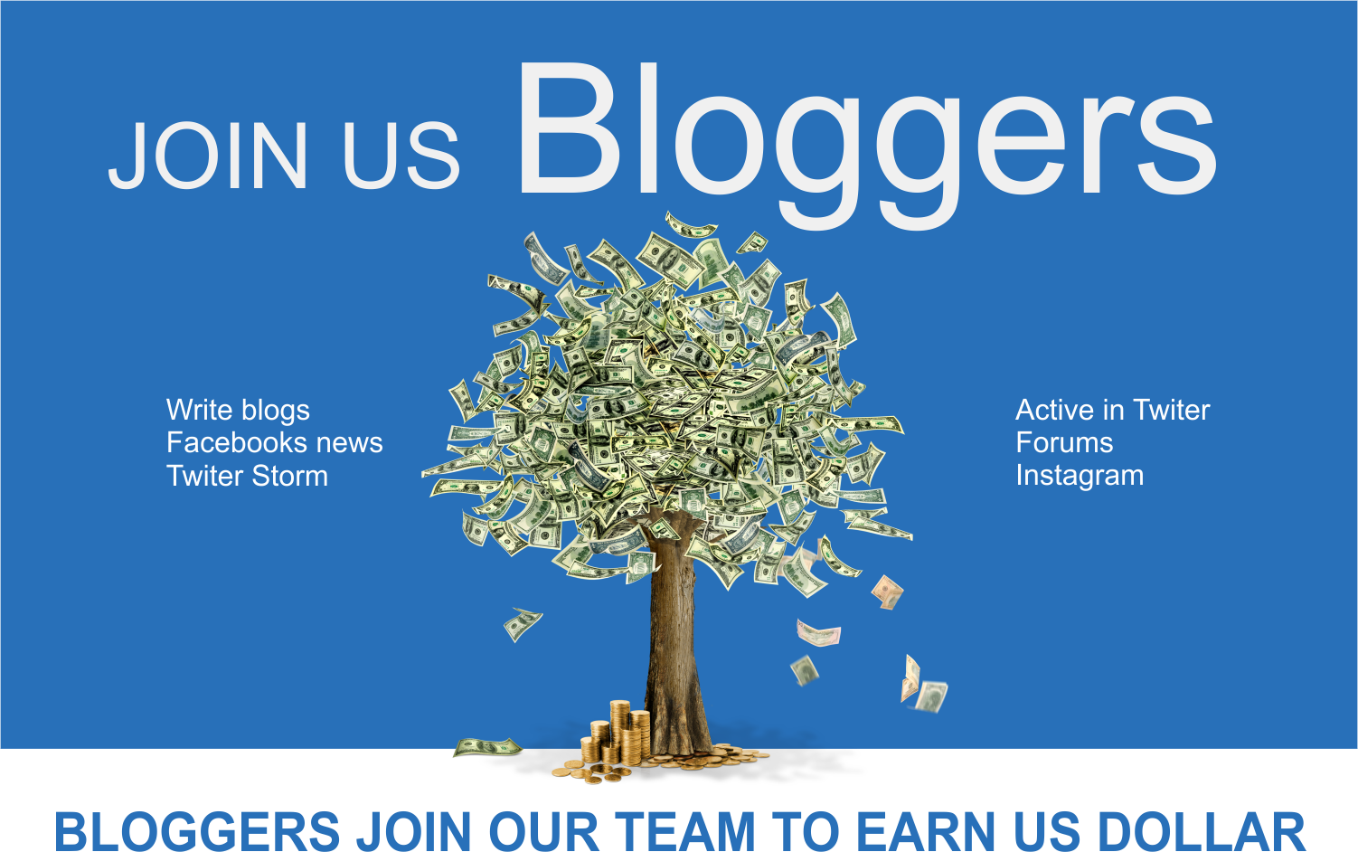 Blogers, Twiters and Facebook active users can join my team. There are requirements if you need to partner with us